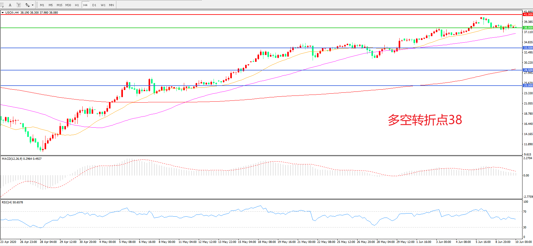 4小时图看,油价冲高回落,短期涨势有所放缓,38美元一线仍处是多空分水岭,均线系统仍呈多头排列,MACD红柱减少,RSI指标走平,日内延续震荡概率较大。