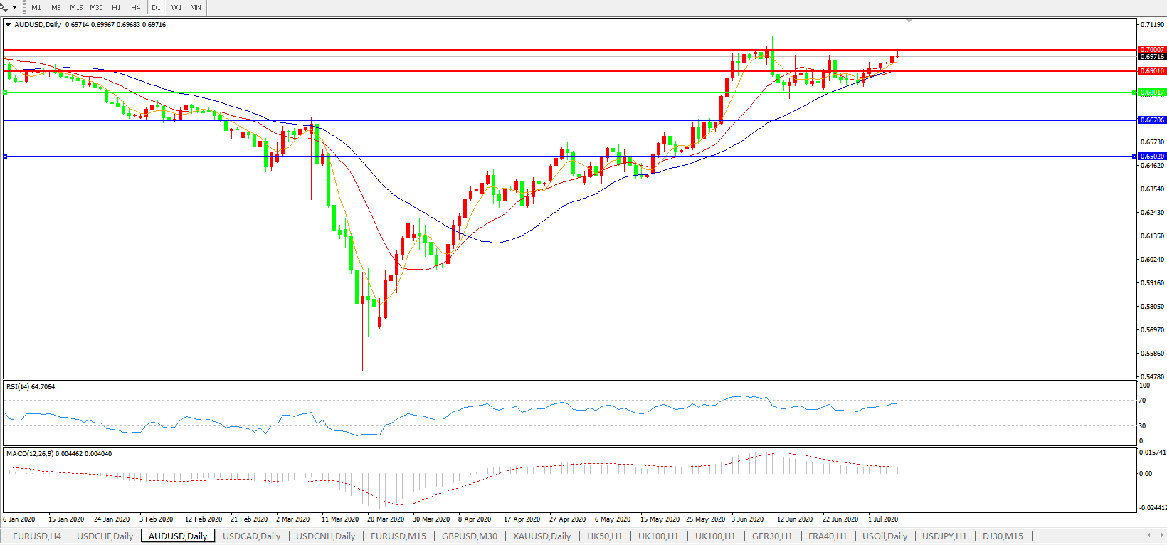 技术面简析:日图均线高位有再度发散上行迹象,汇价持续小幅上攻,MACD运行于0轴上方但量能持续缩量,RSI有走升迹象,预计汇价短线大概率将继续上攻,关注0.7000 关口压制。