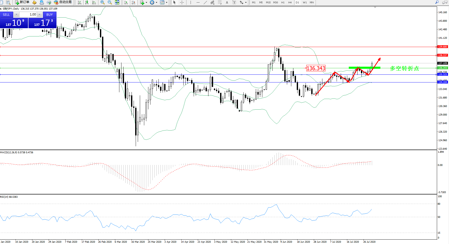英镑兑日圆持续上扬至137.165附近徘徊,美元指数止跌回升, 美国第二季度实际GDP年化季率初值略好于预期,英国在诸多利空的背景下表现出韧性,后市焦点依旧在英欧谈判和英国经济复苏。英国10年期国债收益率跌至创纪录的0.074%,英国无协议脱欧将对英国经济产生重大影响,过早重启英国经济活动将加剧新冠疫情带来的经济损失。未来前景将主要取决于良好的数据和有效的病毒测试的发展。经验显示央行拥有稳定金融市场所需的工具。