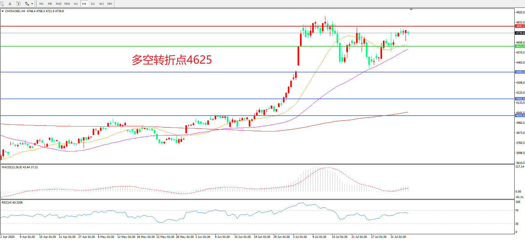 4小时图看,沪深300延续高位震荡,十字星收盘表明多空博弈胶着,三角形整理突破后,短期走势偏强,4800成为上方阻力,均线系统拐头向上, MACD红柱缩短,RSI指标走平,日内延续震荡概率较大。