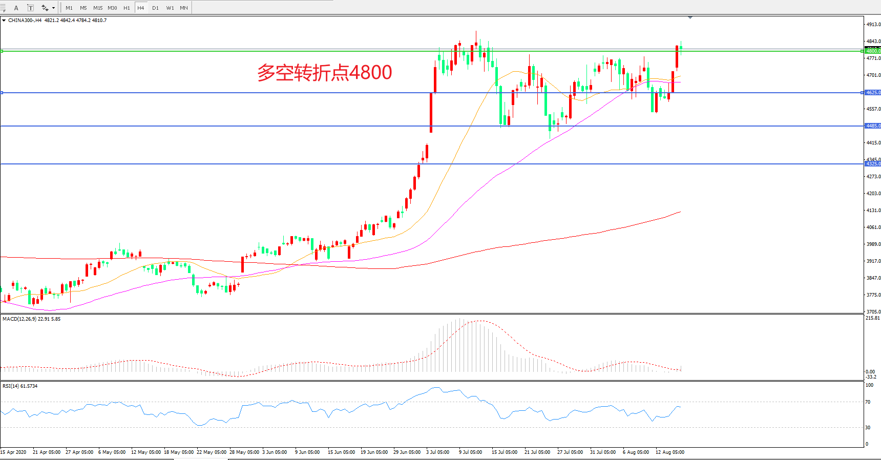 4小时图看,沪深300高开高走,光脚阳线显示短期走势较强,4800成为新的支撑,均线系统走平, MACD红柱增加,RSI指标向上,日内延续上行概率较大。