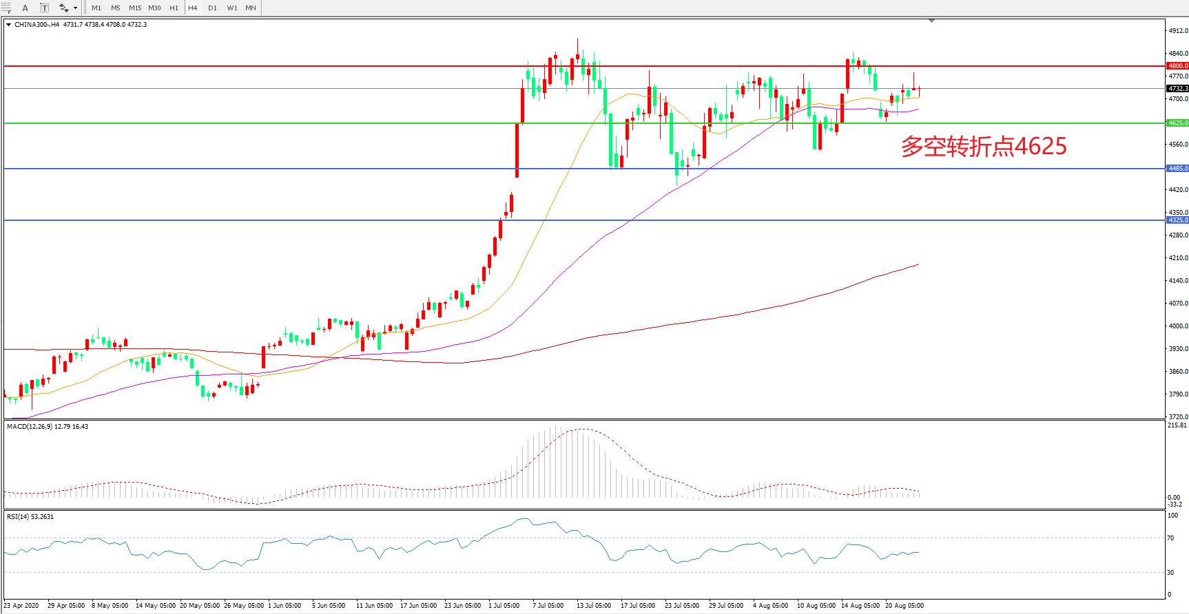 4小时图看,沪深300延续宽幅震荡,整体表现相对低迷,4625成为短期支撑,4800成为上方阻力,均线系统走平, MACD红柱缩短,RSI指标向上,日内延续震荡概率较大。