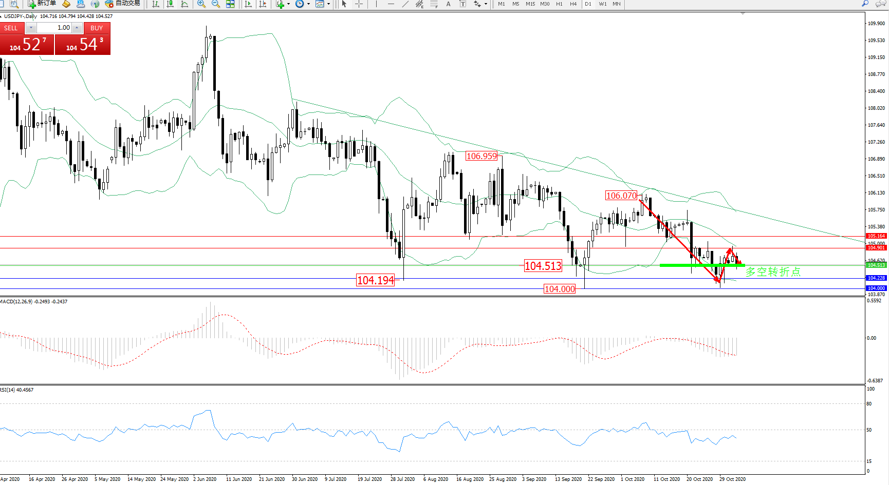 美元兑日圆维持在低位104.498附近整理,日内美元指数大幅走低,市场风险偏好整体回暖,而大华银行技术分析认为,近期仍有投资者押注美元兑日元将跌破关键104.00心理关口,此前强调汇价基本基调有所稳固,但从现在开始的任何上涨都被视为104.50-105.00这一较高交易区间的一部分,虽然周一交投区间窄于预期104.52-104.94,但仍基本符合预期,价格走势没有提供新的线索。美国大选临近,增配亚洲新兴市场股票和货币似乎仍然是最安全的交易,只要投资者相信拜登将胜出。随着宏观前景不再只是由选举情境来决定,即使选举结果一旦确定,市场方向在很长一段时间内可能也不会明朗化。由于美国刺激方案的失败尝试和欧洲的抗疫封锁,市场似乎更关注经济的二次衰退。大选后的意外可能是市场进入年底时的异常波动程度,因为拜登或特朗普的首要任务将是再次应对公共卫生挑战。