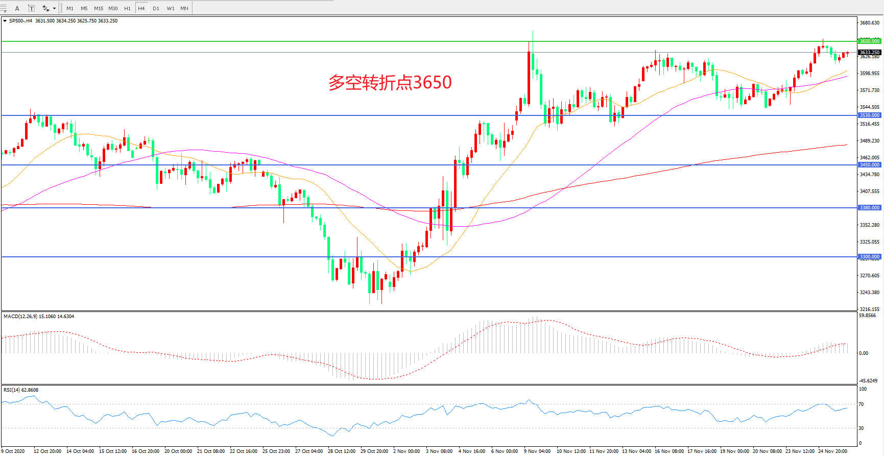 4小时图看,标普500震荡反弹,整体走势偏强,3650成为短期多空分水岭,3530成为短期支撑,短期均线拐头向上,MACD红柱增加,RSI指标向上,日内延续上行概率较大。