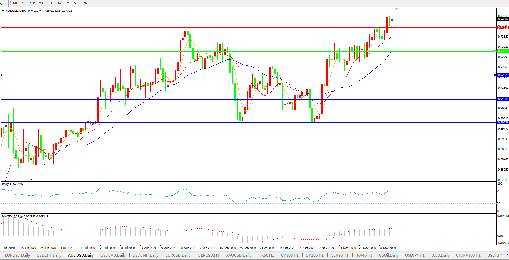 交易策略:0.7300上方看涨,目标0.7400、0.7500