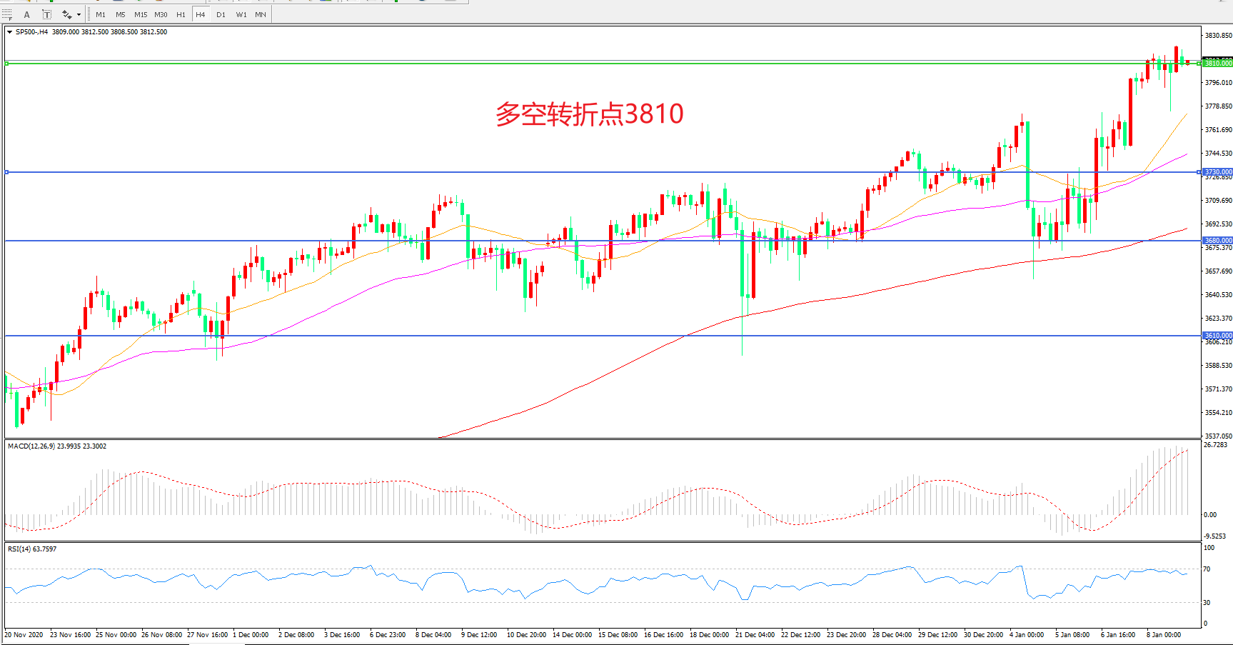 4小时图看,标普500阳线连续拉升,短期走势偏强,均线系统拐头向上,MACD红柱增加,RSI指标走平,日内延续上行概率较大。