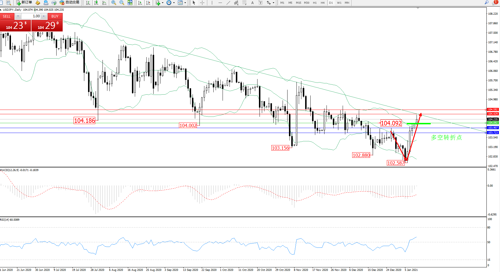 交易策略:104.092上方看涨,目标104.429、104.592