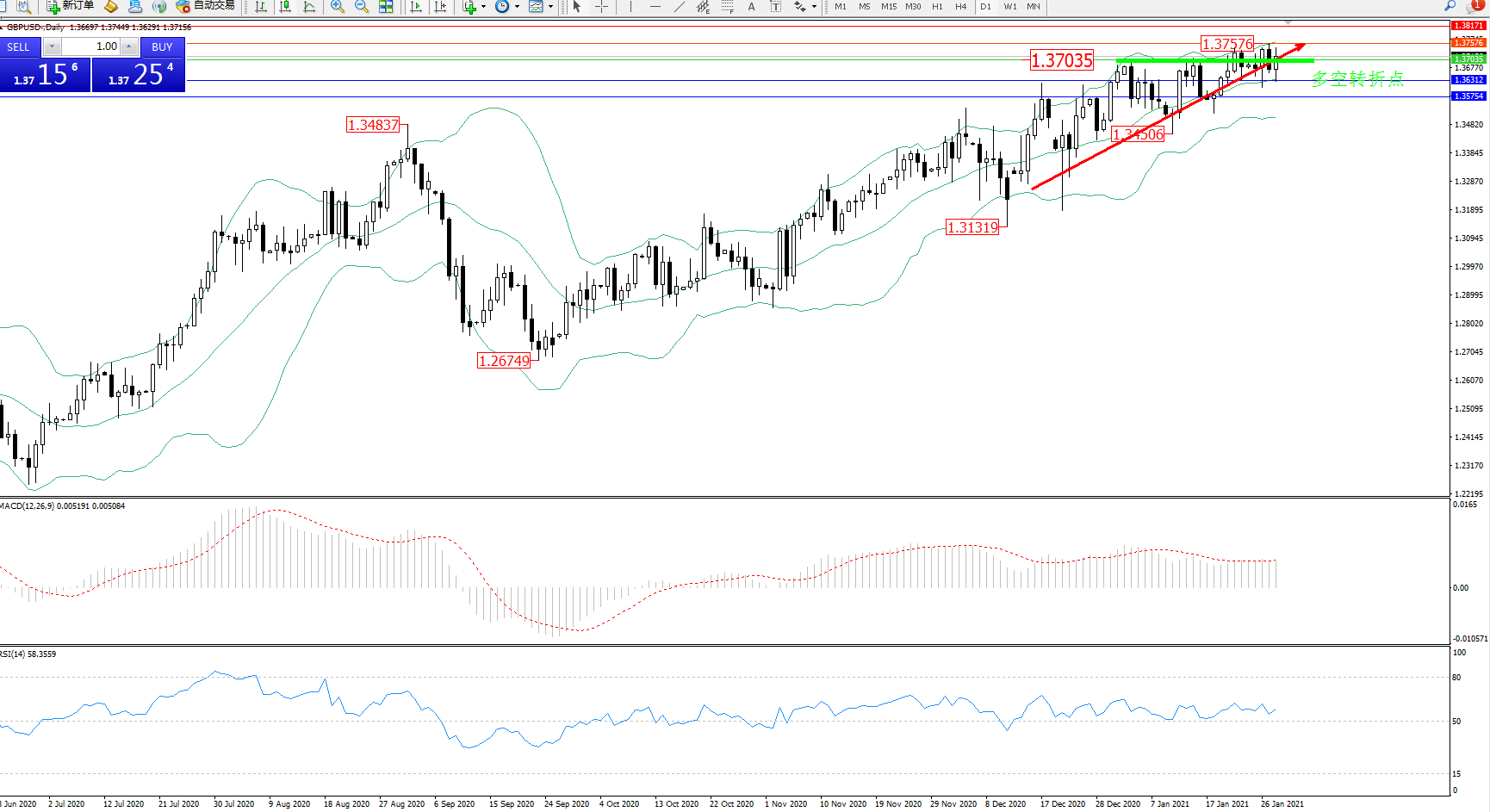 交易策略:1.37035上方看涨,目标1.37576、1.37171
