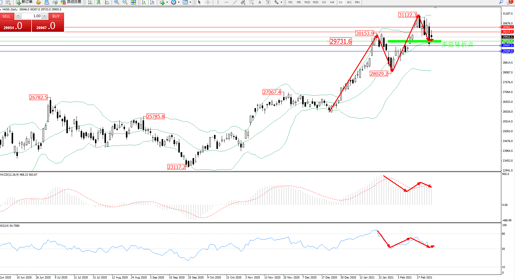 技术点评:多头动力延续布林带指标中上轨区间持续震荡上扬态势良好,高位抵达31122位置节点后遇阻开始震荡回撤下行,触及中轨附近节点后有缓慢回升迹象,关注中轨附近节点,布林带指标呈张口走势后开始有收口迹象,MACD指标处于多头区域持续震荡后有缓慢回撤下移迹象,RSI指标处于多头区域持续震荡回撤至50均衡线上方弱势徘徊中;