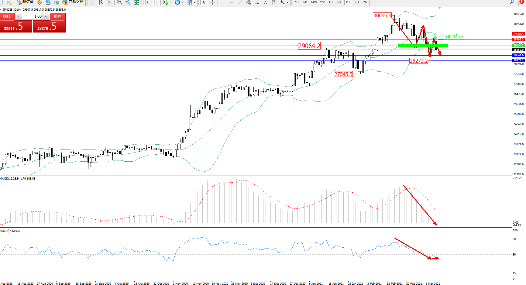 技术点评:高位空头动力维持真下行,低位跌破布林带指标下轨附近节点抵达28273位置后开始反转上移,但高位空头动力依旧强劲,未见止步迹象,短暂回升后再度下移,布林带指标呈张口走势持续中,关注中轨附近关键节点,MACD指标处于多头区域高位震荡下行即将触及0轴线附近节点,RSI指标处于多头区域维持震荡下行至50均衡线附近弱势徘徊中;