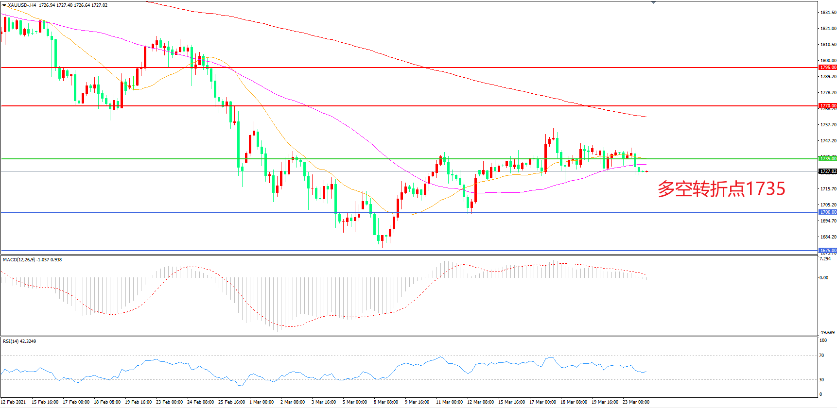 周二(3月23日),受拜登最新的刺激法案影响,流动性泛滥正式开始,美国国债收益率虽有回落,但在美元全天保持上行,金价表现依然相对低迷,现货黄金小幅回落后收报1726.94美元/盎司。目前美国即将开始2000亿美元的美债拍卖,市场担心美债收益率会再度上行,从而再度施压黄金。