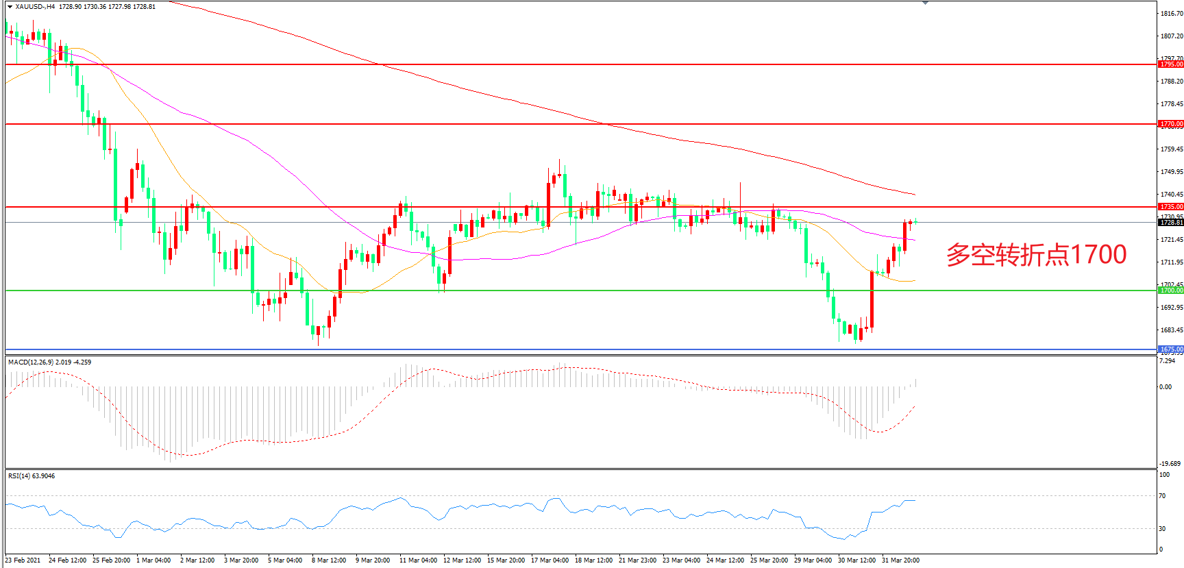 4小时图看,金价回踩1675后大幅反弹,1700关口被突破后,短期走势回暖,200周期均线成为上方阻力,1735成为短期多空分水岭,MACD红柱增加,RSI指标走平,日内震荡上行概率较大。