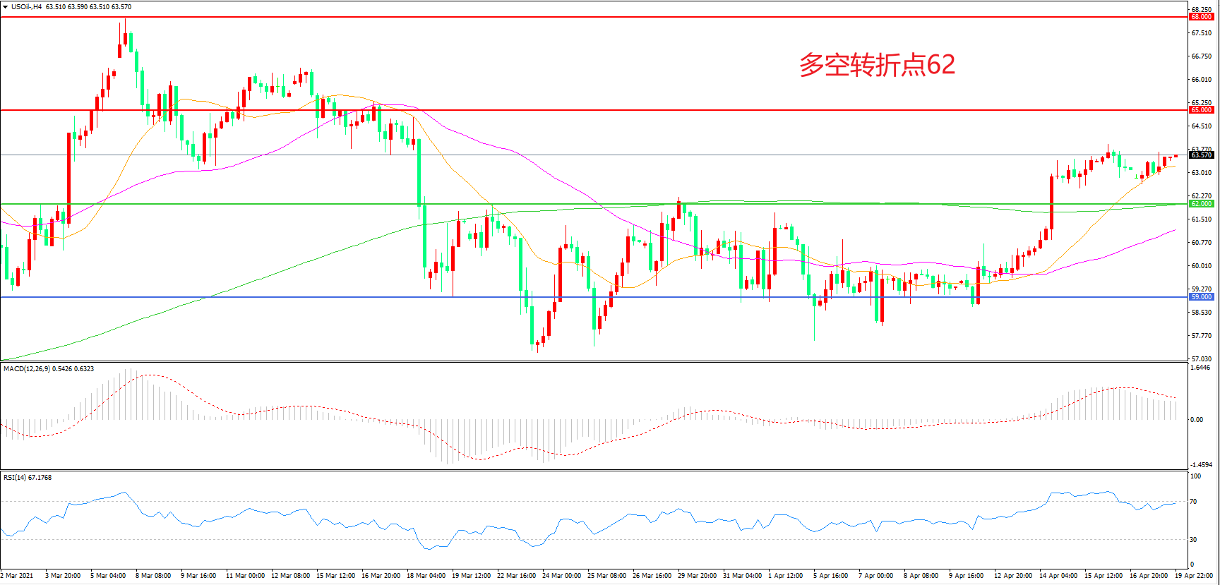 周一(4月19日),美元指数大幅走弱支撑大宗商品价格,但印度等国家日益增加的疫情加剧了人们对市场的担忧,美国WTI原油延续高位震荡,收报63.58美元/桶。中期看,虽然近期油价大幅上行,但油价的上行是基于对夏季及下半年需求的强势恢复预期,当前在疫情局势下并未实质性的大幅增长,需要有后续利多跟进才有继续推涨动力。