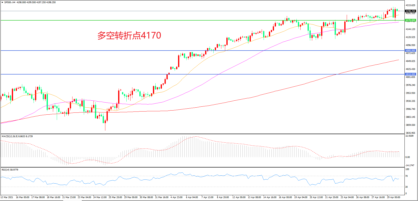4小时图看,标普500跌突破4170后延续高位震荡,价格整体波幅不大,均线系统逐渐走高,MACD红柱增加,RSI指标走平,日内延续震荡概率较大。