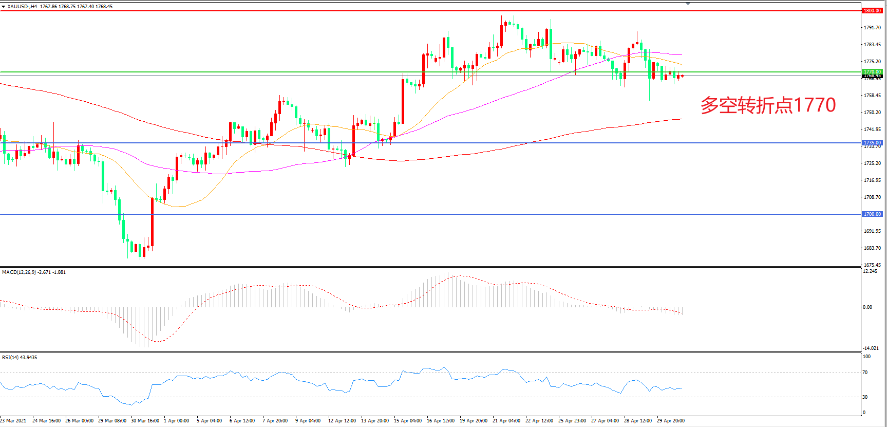近期,由于美元指数回吐前期涨幅,10年期美债收益率重新走低一度推升金价走高,但美国经济数据大幅向好,总统拜登的刺激措施不断加码令美联储继续维持宽松政策的理由越来越牵强,宽松政策的收紧预期限制了金价的反弹力度。现货黄金高位震荡后收报1768.25美元/盎司。