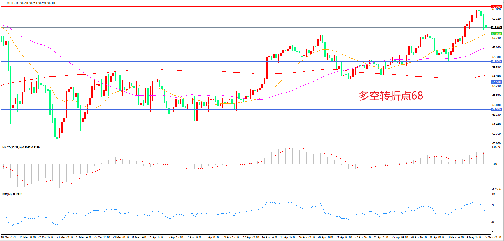 4小时图看,油价冲击70美元附近后快速回落,短期涨势受到遏制,但形态上依然处于多头趋势之内,均线系统呈多头排列,MACD红柱缩短,RSI指标向下,日内震荡上行概率较大。