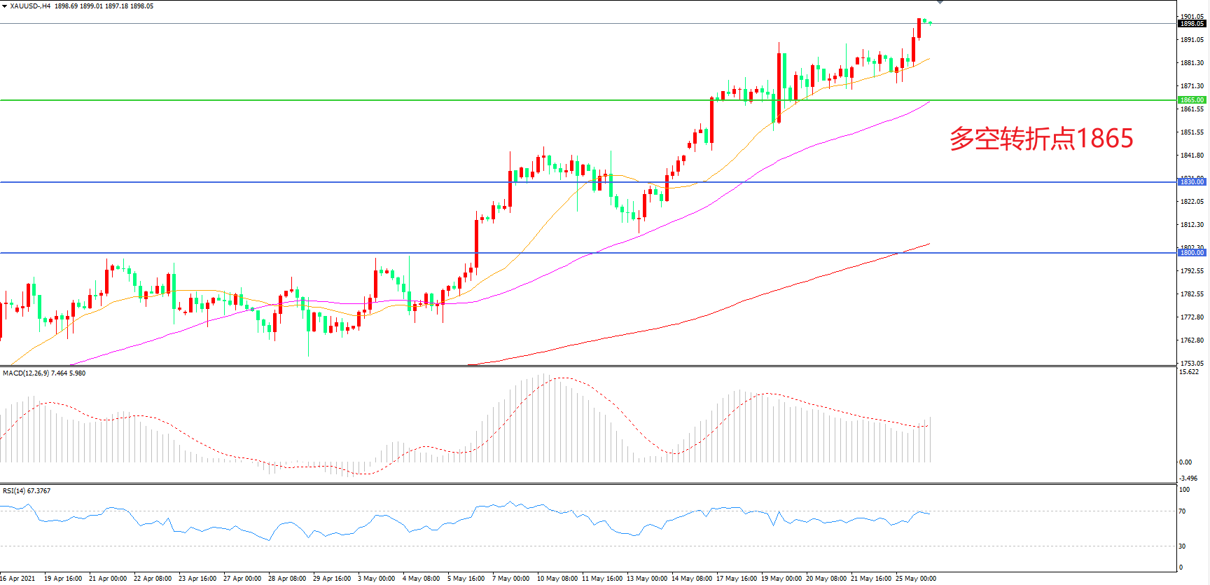 周二(5月25日),2年期美国国债标售需求强劲,助推美债收益率进一步下行,美元指数在美联储官员重申保持宽松的信号后进一步下跌,得到美元和美债收益率下行支持的金价高歌猛进,大幅拉升后收报1898.53美元/盎司。只要全球货币政策不加速收紧,黄金短期涨势就不会逆转。