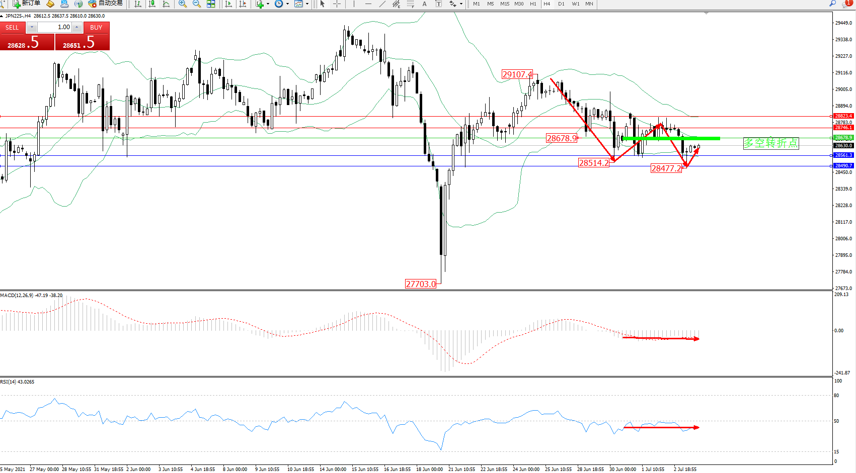 技术点评:高位空头到利空维持在布林带指标中下轨区间持续震荡下行,低位抵达28477位置后短暂回升维持窄幅整理平移中,布林带指标呈下行趋势走势后开始缓慢收口平移中,关注中轨附近节点,MACD指标处于0轴线下方空头区域维持整理平移中,RSI指标处于50均衡线下方空头区域持续整理中;