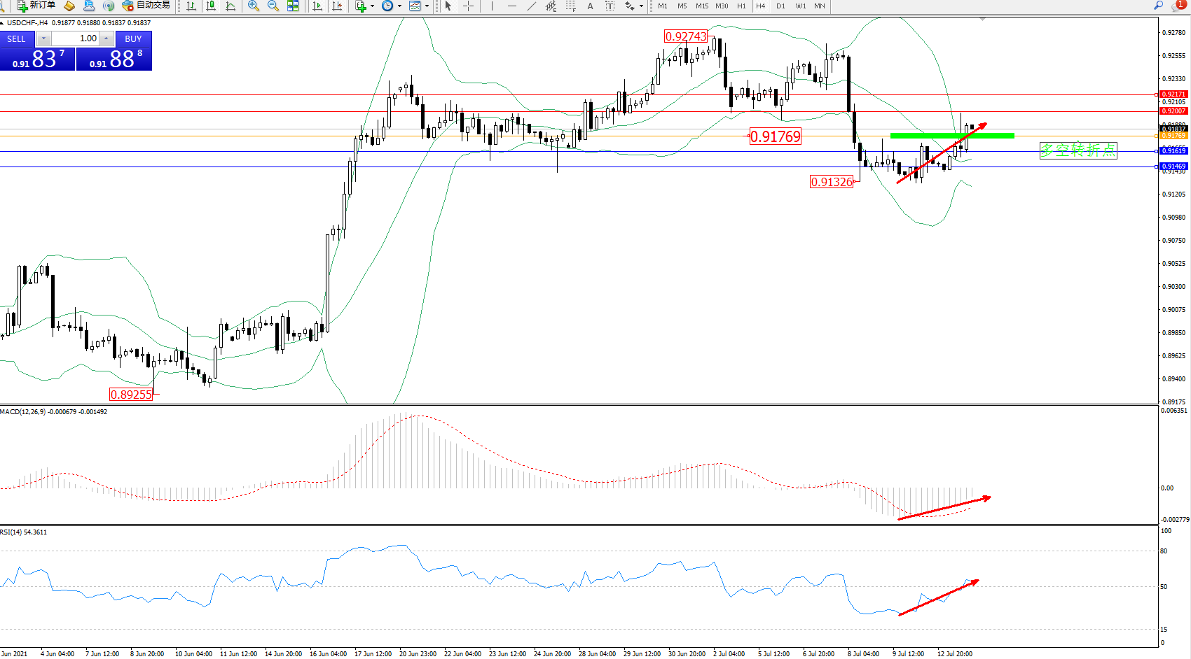 交易策略:0.91769上方看涨,目标0.92007、0.92171