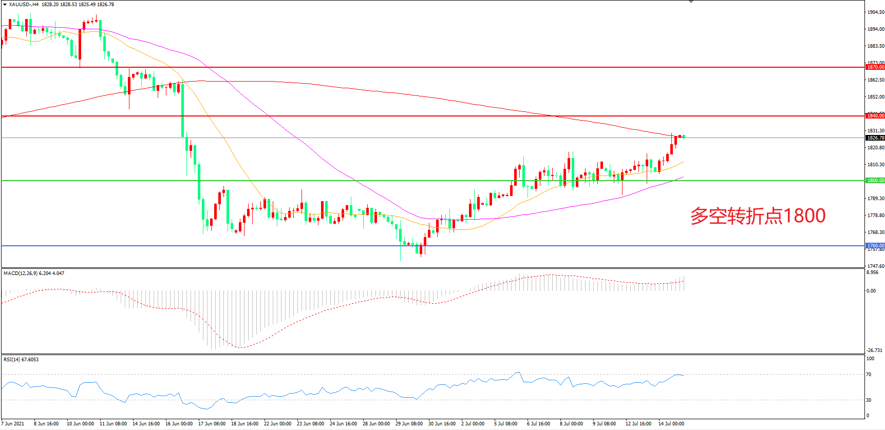 周三(7月14日),美联储主席鲍威尔在听证会上再度发布“鸽派”言论,声称经济复苏进程不足以令联储开始缩减QE,现货黄金在三波巨量资金的推动下,一度拉升逾10美元,收报1826.37美元/盎司。鲍威尔的发言为市场传递了一种信号,即尽管通胀数据升温,美联储仍将保持相当宽松的政策, 这将直接导致美元走软和美国国债收益率下滑,为金价上行提供进一步支撑。