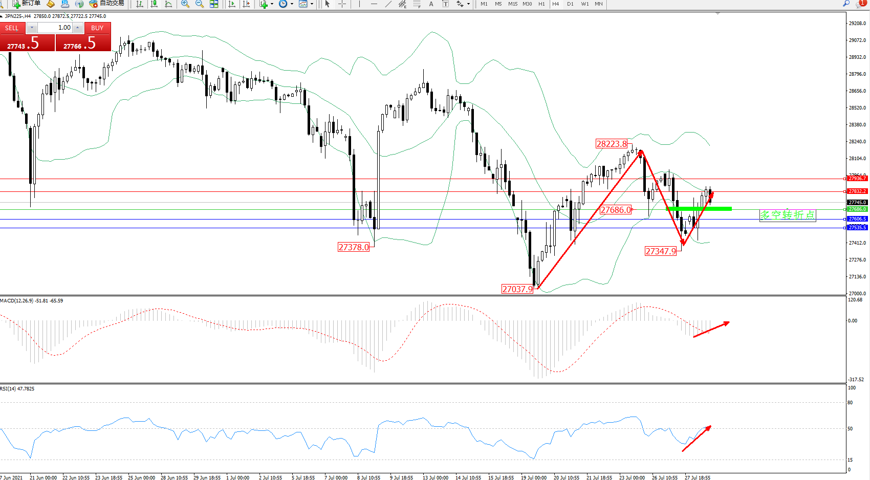 技术点评:空头动力延续布林带指标通道中下轨区间持续震荡下行,低位抵达27347位置后反转上移,触及中轨附近节点后开始徘徊,布林带指标呈收口走势持续中,MACD指标处于空头区域震荡缓慢上移,RSI指标处于空头区域窄幅震荡上移至50均衡线附近整理;