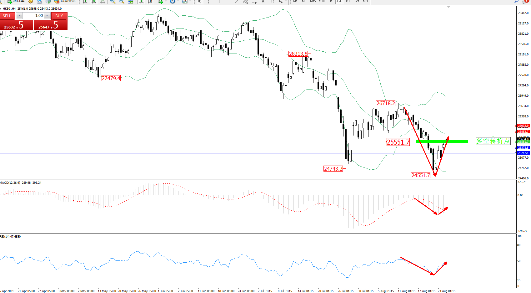 技术点评:空头动力延续布林带指标下轨附近持续震荡下行,低位抵达24551位置后得到支撑呈V型反转上扬,即将触及布林带指标中轨附近节点,多头动力有进一步回升迹象,布林带指标呈收口走势持续中,MACD指标处于空头区域低位震荡缓慢上移,RSI指标处于空头区域持续震荡向上移动;