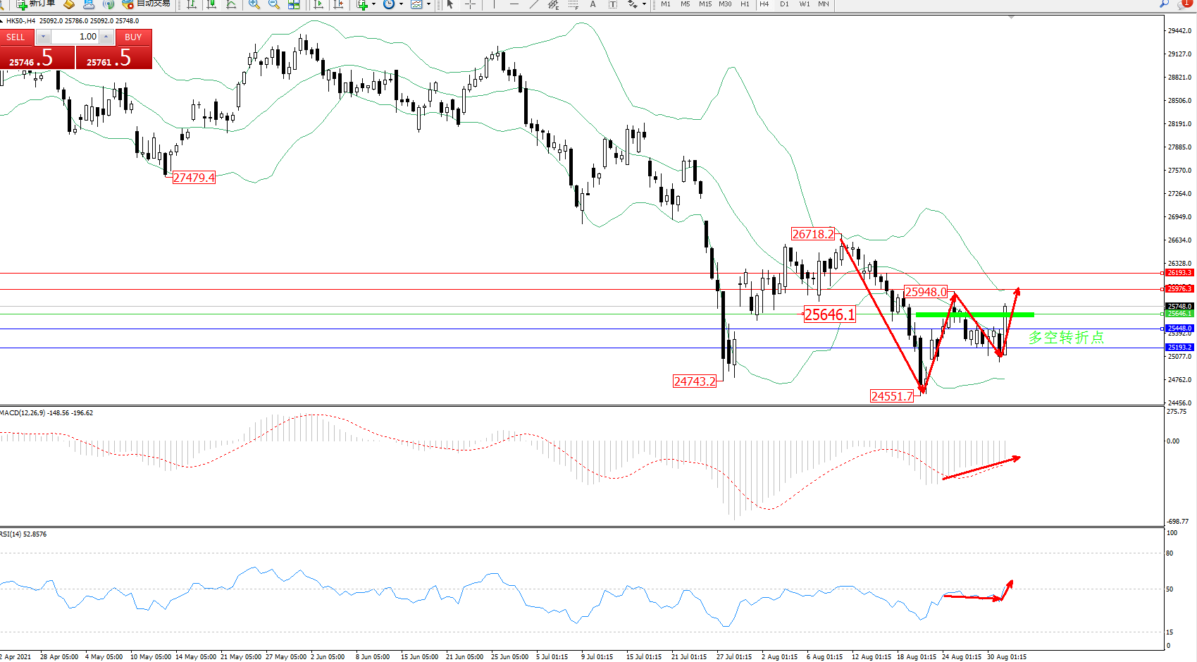 香港恒生指数8月31日(周二)收盘上涨339.45点,涨幅1.33%,报25878.99点;港股午后拉升转涨,三大指数尾盘涨幅进一步扩大,科技股领衔走高,带领市场情绪明显回升。恒生科技指数涨3.39%报6607点。大型科技股美团大涨9%,快手大涨8.6%,阿里巴巴大涨4.6%,腾讯大涨3.3%,惟网易跌2%;保险股表现较弱,中国平安跌超近4%,濠赌股、半导体股走低明显。今日大市成交额为2133亿港元,南下资金逆势净流出36.93亿港元。