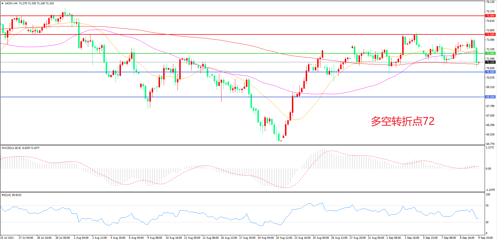 4小时图看,油价窄幅震荡后长阴下破,整体表现相对低迷,70.5美元形成下方支撑,72美元成为上方阻力,MACD红柱缩短,RSI指标走平,日内弱势回调概率较大。