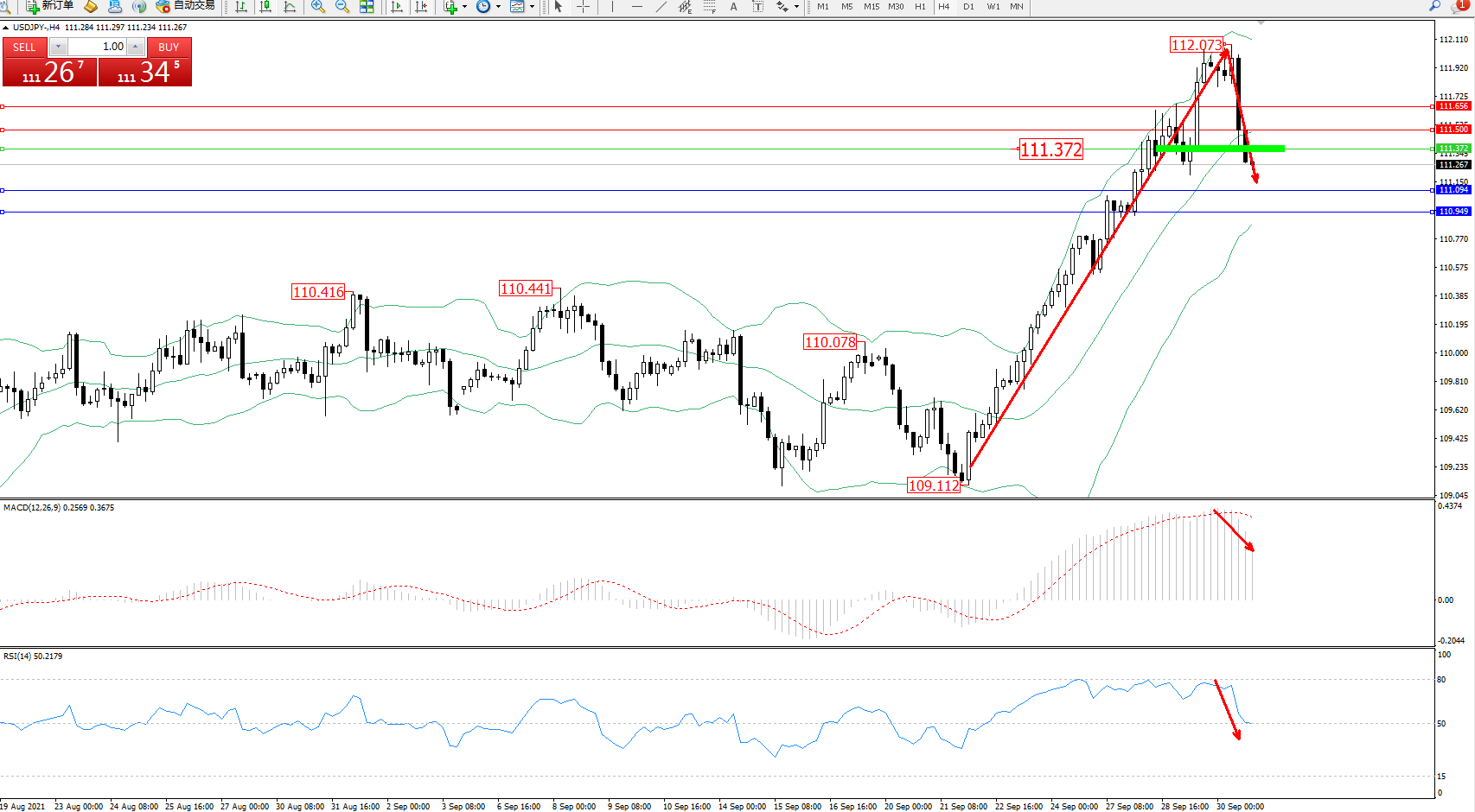 技术点评:多头动力延续布林带指标通道中上轨区间持续震荡上扬,高位抵达112.073位置后遇阻回撤,高位空头动力急转直下,跌破布林带指标中轨附近节点后有继续向下移动态势,布林带指标呈上行走势持续拉升后高位开始有缓慢收口迹象,MACD指标处于多头区域高位整理回撤,RSI指标处于多头区域急速下挫至50均衡线上側弱势徘徊;
