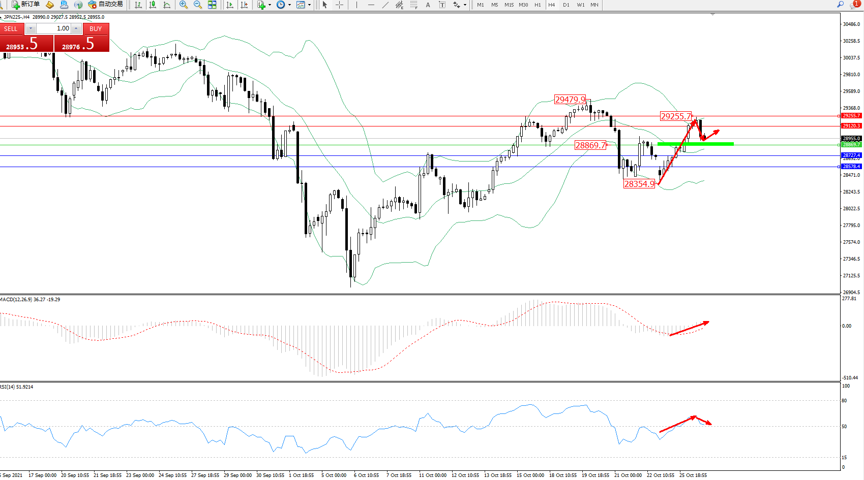 日经225指数10月26日(周二)收盘上涨517.09点,涨幅1.81%,报29117.50点。日本央行本周四会议料将维持巨大刺激措施,同时调降今年的通胀预测,暗示日本央行无意跟进其他主要央行准备撤出疫情危机时期政策的路线。尽管原材料价格升势已造成日本批发物价涨幅创13年高位,但消费者物价涨幅仍顽固守在近零水准,因国内支出疲软,令企业难以将成本上涨转嫁给消费者。多位消息人士表示,日本央行料将下修本财年的经济增长及通胀预测,但维持经济将温和复苏的预测。