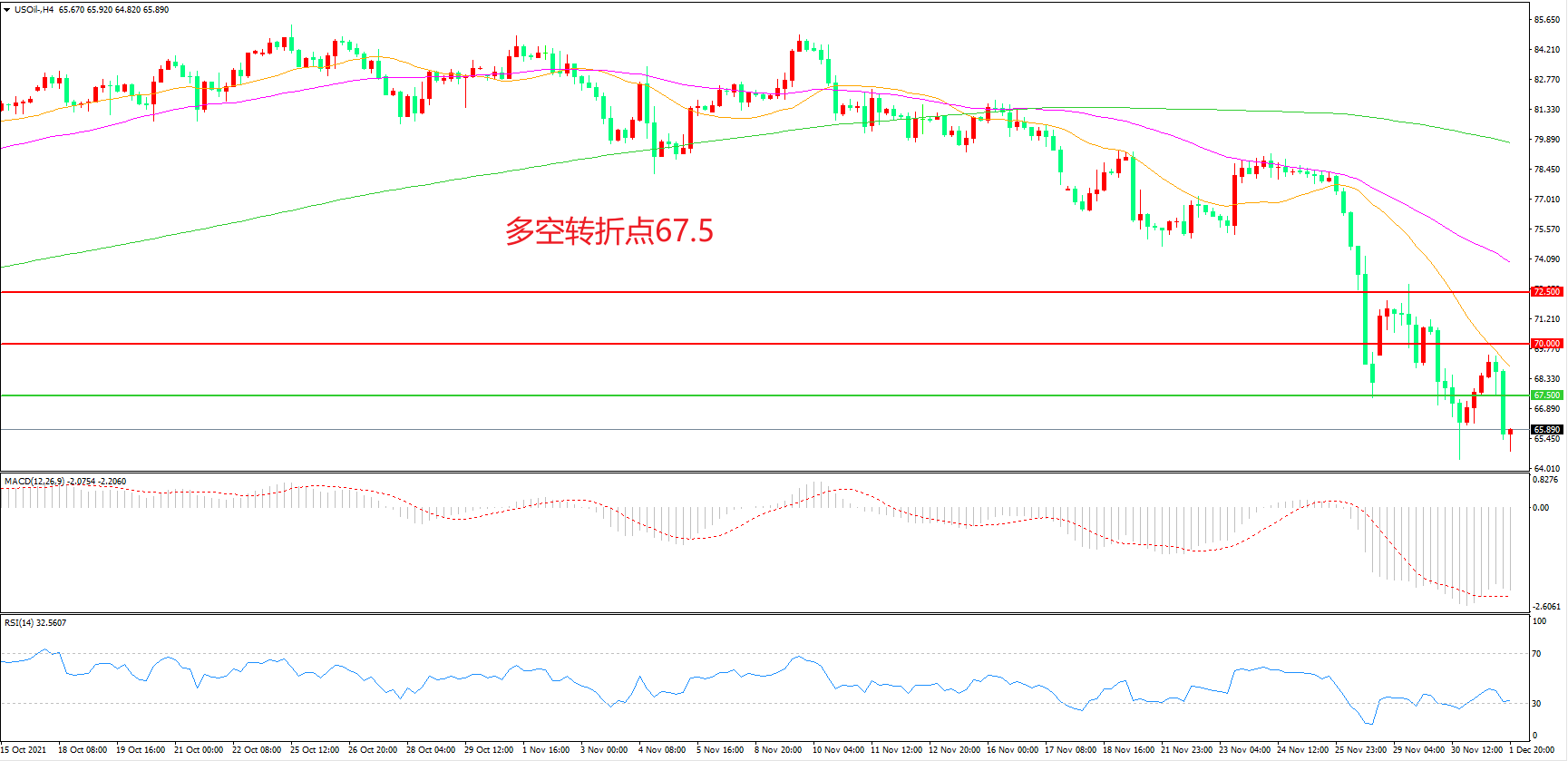 周三(12月1日),美国确认第一例奥密克戎毒株感染病例,且感染者已经完成新冠疫苗接种,疫情发展趋势再度给油价带来冲击,美国WTI原油破位下行,收报64.65美元/桶。目前市场只能寄希望于OPEC会议能够给出些许的利好,比如OPEC+放弃增加40万桶的产量或者小幅的减产,否则悲观的情绪仍会持续。