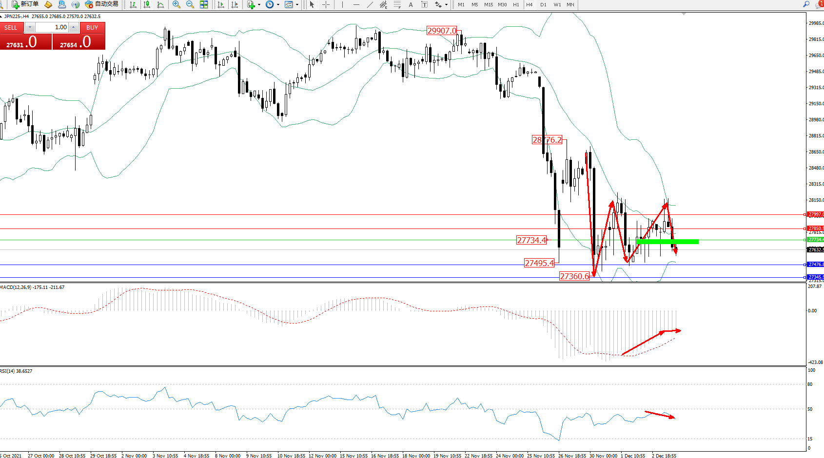 技术点评:空头动力延续布林带指标通道中下轨区间持续震荡下行后,低位抵达27360附近后开始反转回升,纠结于布林带指标通道中下轨区间持续宽幅震荡,短期空头动力有继续下行态势,布林带指标呈收口走势后开始缓慢张口,MACD指标空头区域低位整理缓慢上移后开始平移,RSI指标处于空头区域维持整理上移后开始弱势下行;