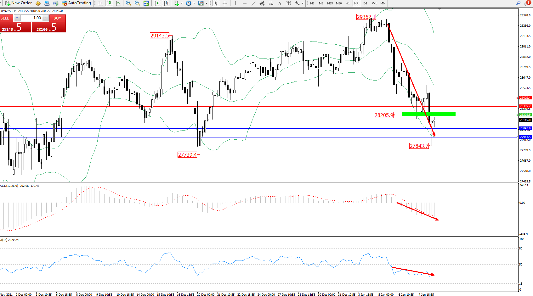 技术点评:空头动力延续布林带指标通道中下轨区间持续震荡下行,低位抵达27843位置后得到支撑快速回升,短期多头动力伺机入场,布林带指标呈收口走势持续向下移动态势良好,MACD指标处于空头区域维持整理向下移动,RSI指标处于空头区域持续震荡下行中;