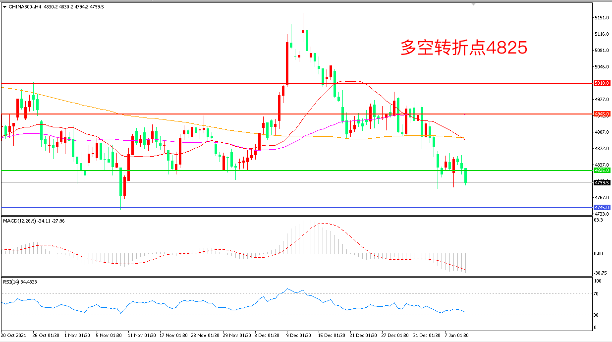 4小时图看,沪深300低位震荡再度下破,空头趋势明显,短期均线下穿形成死叉, MACD绿柱增加,RSI指标走平,日内震荡下行概率较大。