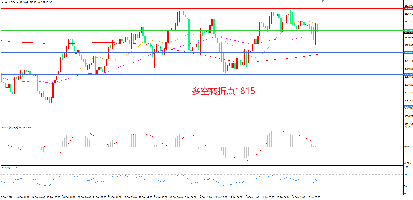 4小时图看,金价以1815为重心展开震荡,55中期均线成为短期支撑,行情高点逐步降低 MACD红柱缩短,RSI指标走平,日内延续震荡概率较大。
