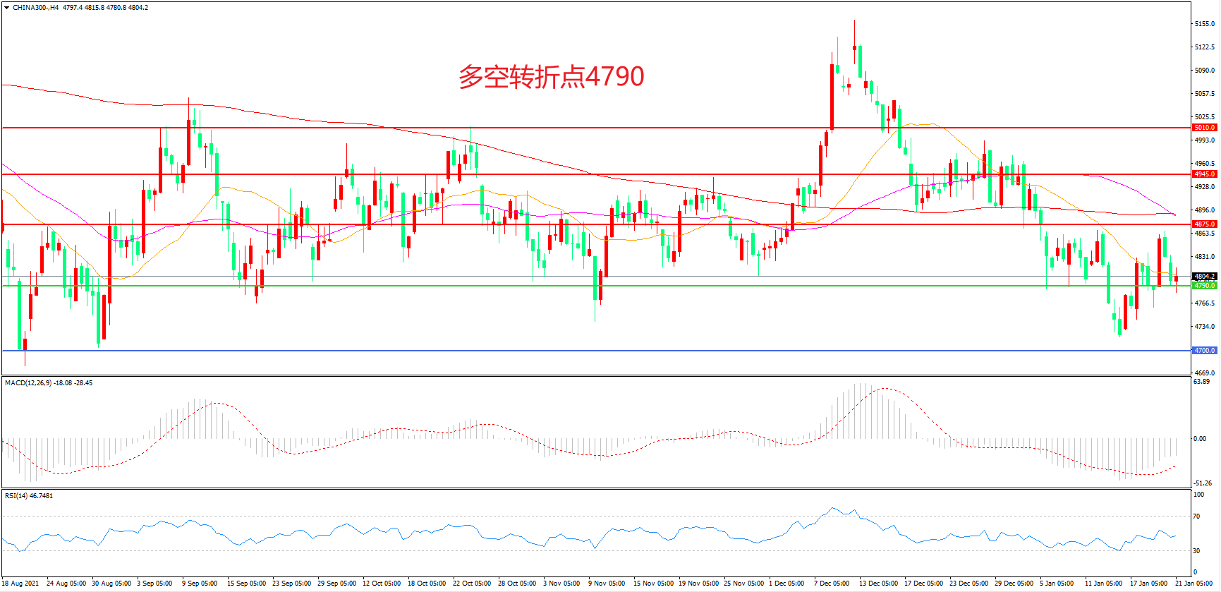 4小时图看,沪深300延续宽幅震荡形态,整体表现较为低迷,4875成为上方阻力,4790成为下方支撑, MACD绿柱缩短,RSI指标走平,日内延续震荡概率较大。