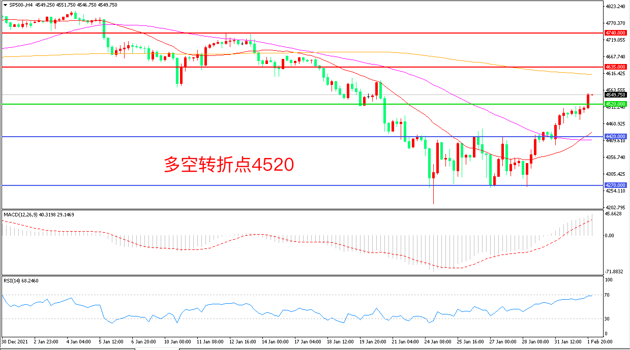 4小时图看,标普500震荡上行后长阳拉升,多头形态初现,4520成为多空分水岭,200周期均线成为上方阻力,MACD红柱增加,RSI指标走平,日内延续上行概率较大。
