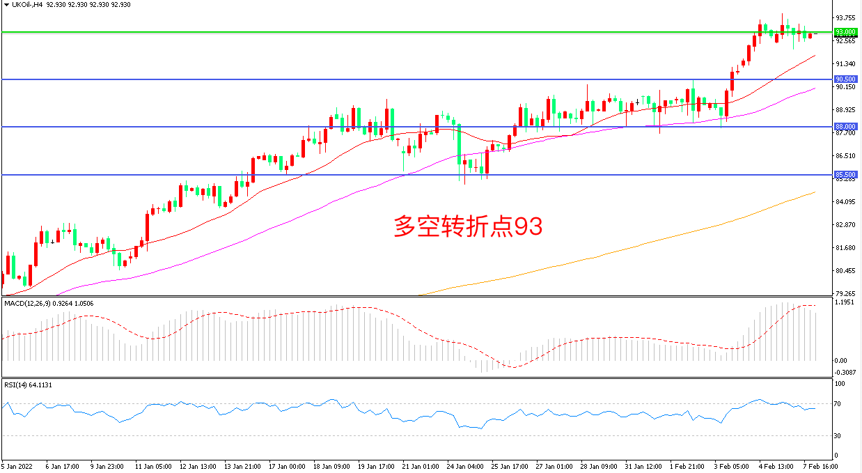 4小时图看,油价连续拉升后小幅回落,整体表现偏强,均线系统拐头向上,93美元成为多空分水岭,MACD红柱缩短,RSI指标走平,日内震荡上行概率较大。