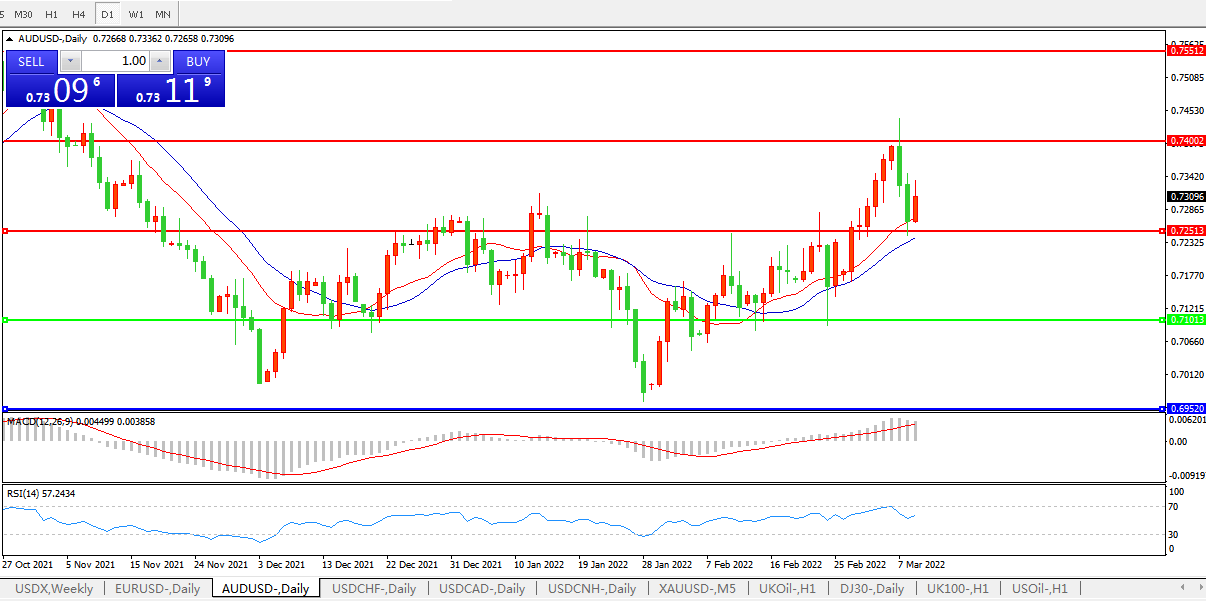 技术面简析:日图均线呈多头排列,汇价小幅上行,MACD运行于0轴上且量能小幅缩量,RSI回落后走升,预计汇价大概率将在回落整理后进一步上行。