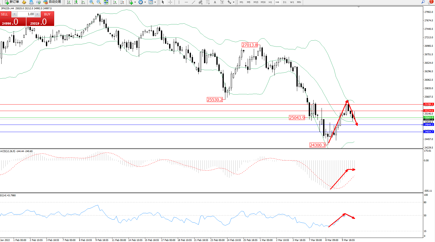 日经225指数3月10日(周四)收盘上涨945.97点,涨幅3.83%,报25663.50点。日本首相岸田文雄:看到物价上涨的广泛影响。政府有必要对价格问题做出协调一致的反应。受俄乌局势影响,七国集团将于10日以在线方式举行能源部长会议。日本经济产业大臣萩生田光一将出席会议。会议将讨论在对俄实施经济制裁的背景下,如何应对原油价格上涨,以及减少对俄罗斯资源的依赖等问题。