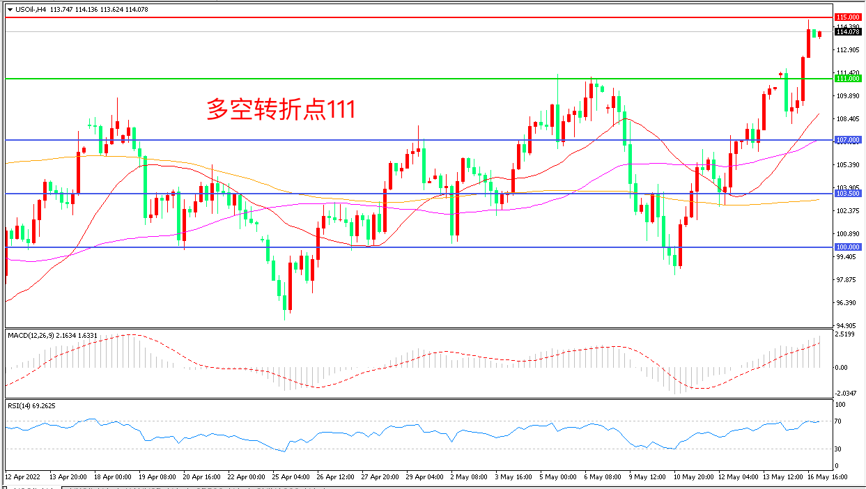 4小时图看,油价长阳连续拉升,短期走势偏强,均线系统拐头向上,MACD红柱增加,RSI指标走平,日内震荡上行概率较大。
