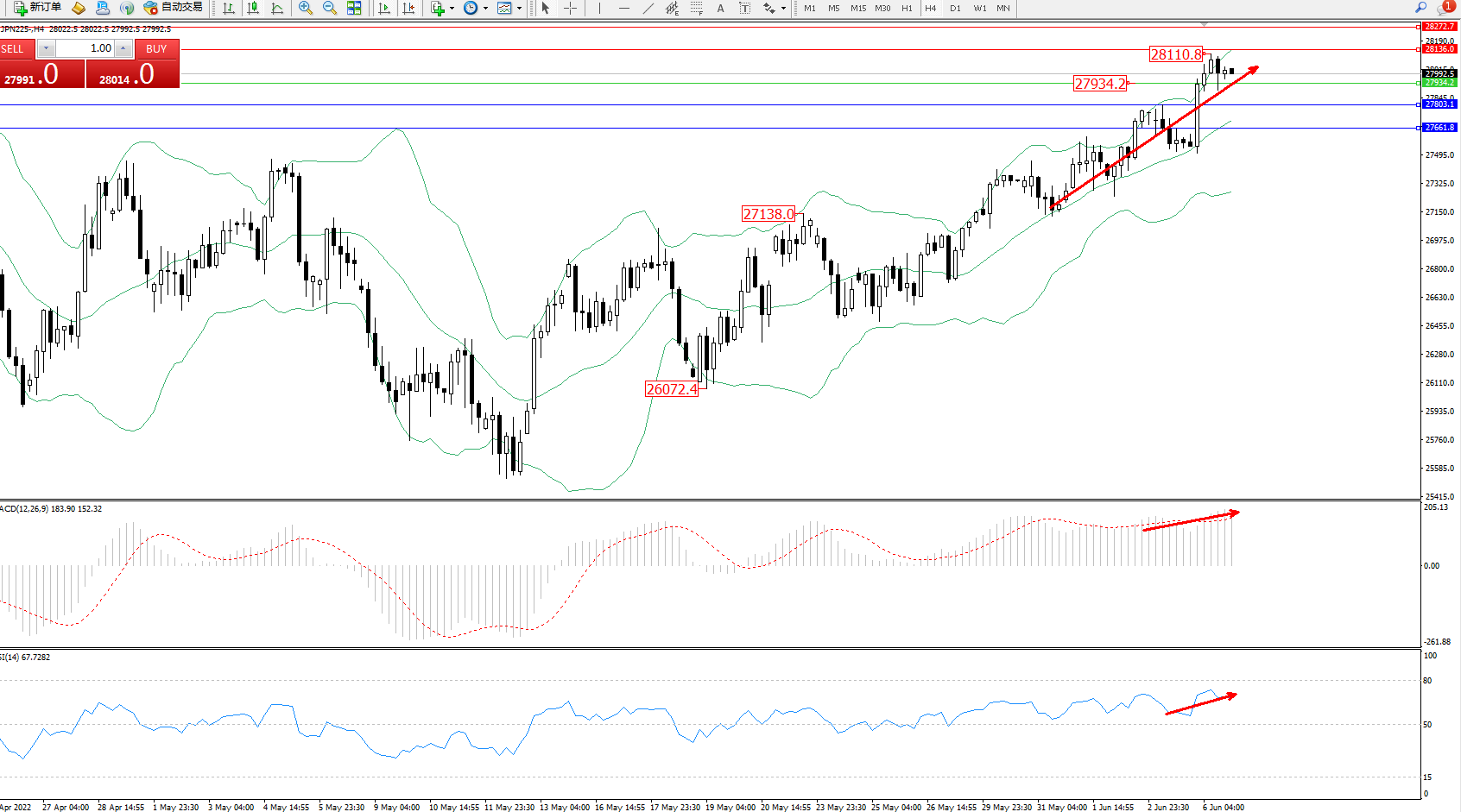 日经225指数6月6日(周一)收盘上涨167.43点,涨幅0.60%,报27929.00点。日本央行行长黑田东彦今日表示,日本经济仍处于从疫情复苏的过程,并面临商品价格上涨的下行压力。