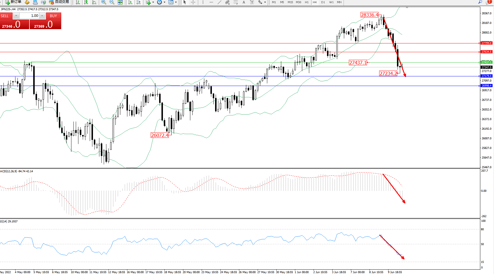 技术点评:高位空头动力延续布林带指标下轨附近急速下挫,低位抵达27234附近节点后整理,短期空头动力有继续向下移动迹象,布林带指标呈张口走势持续中,MACD指标处于0轴线下方空头区域不断下移,RSI指标处于50均衡线下侧持续下行;