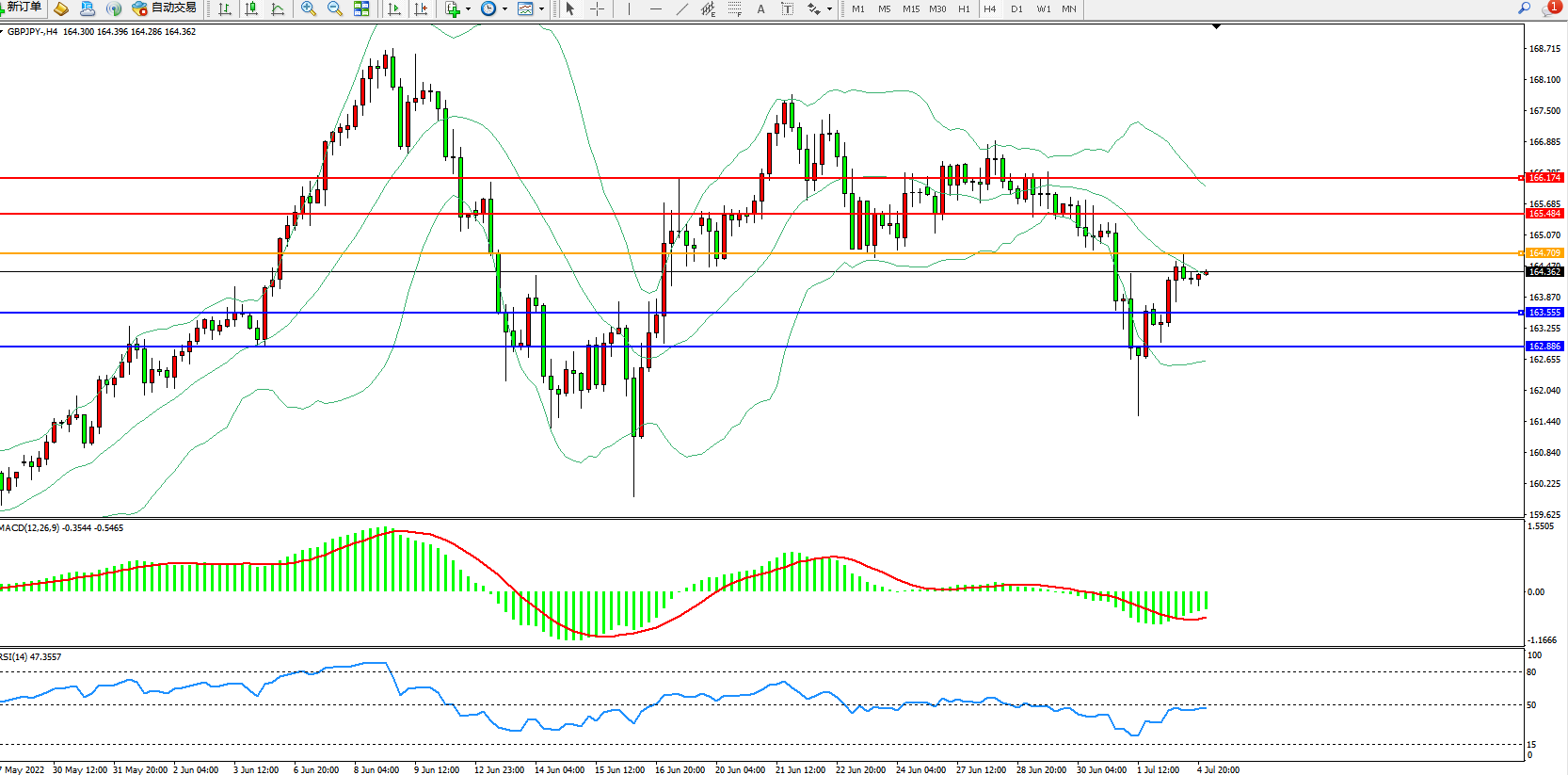 4小时图看:短期V型反转上移至布林带指标中轨附近节点后整理,布林带指标呈收口走势中,MACD指标处于空头区域维持弱势整理上移,RSI指标处于50均衡线下侧弱势徘徊;