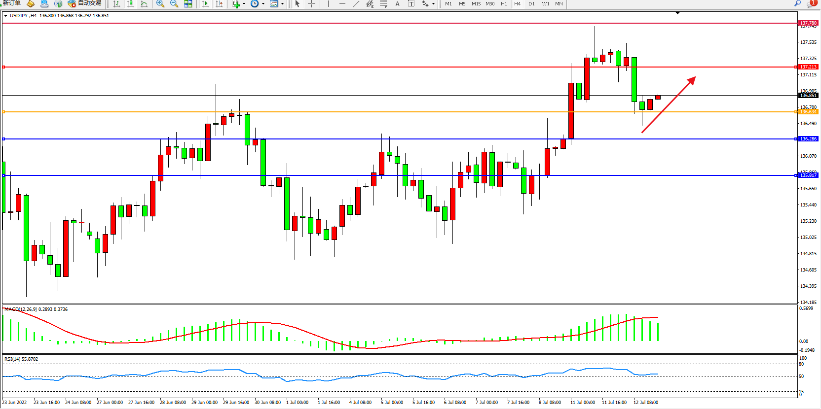 4小时图看:多头动力维持震荡上扬,屡破新高后出现回撤,但市场上扬走势持续,MACD指标处于多头区域高位整理,RSI指标处于50均衡线上側徘徊;