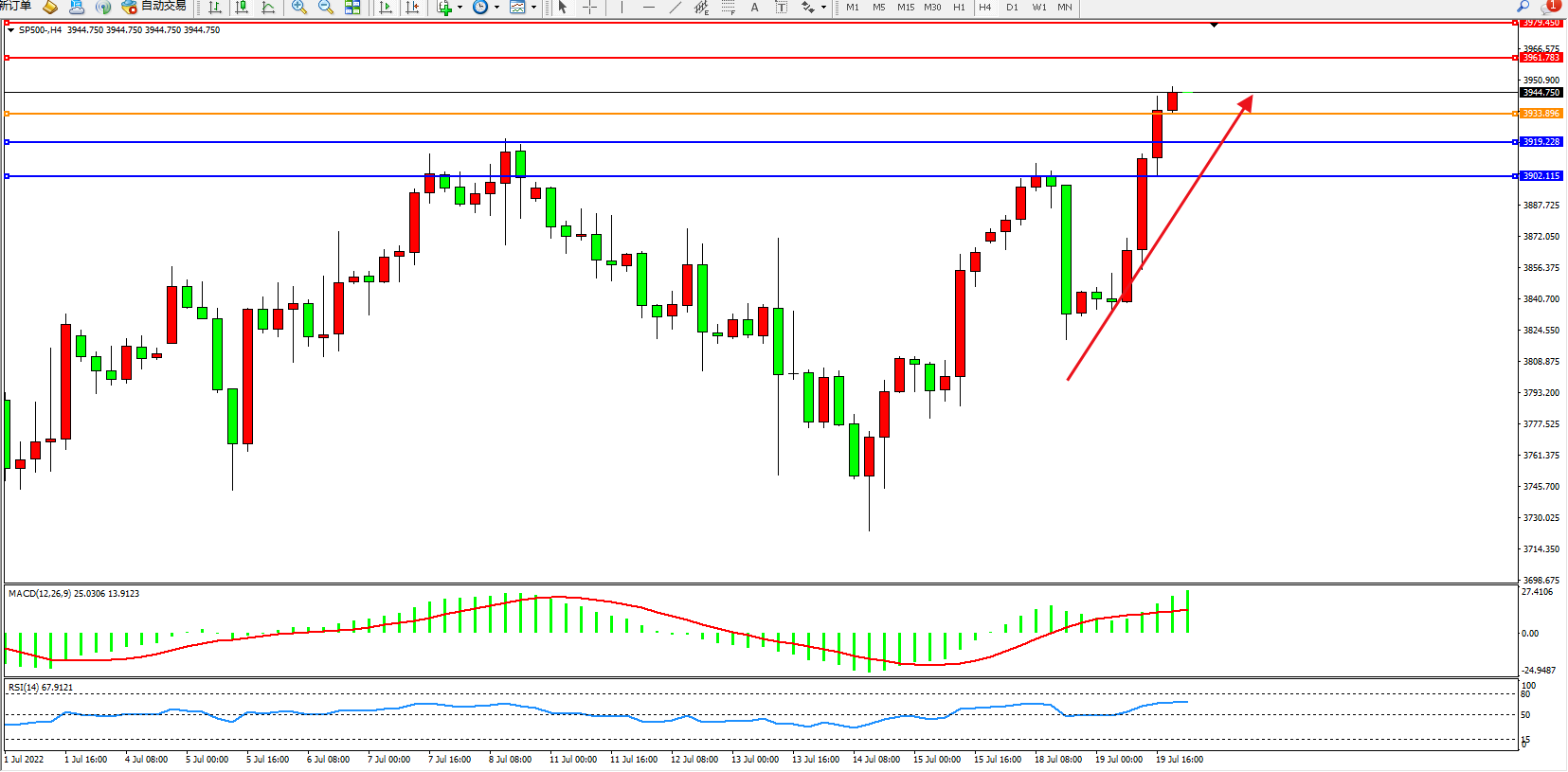 标普500指数7月19日(周二)收盘上涨101.25点,涨幅2.64%,报3932.10点;标普500指数急升2.8%,创下6月9日以来的最高收盘水平。更多企业追随大银行脚步,公布超出预期的盈利,让担心通胀上升和美联储收紧政策影响企业利润的投资者松了口气。