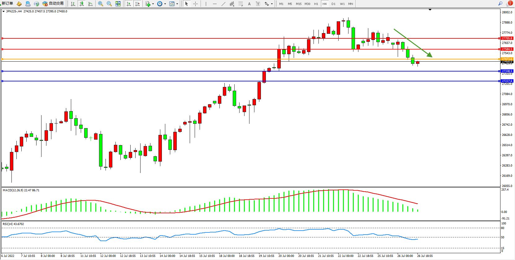 日经225指数7月26日(周二)收盘下跌58.75点,跌幅0.21%,报27640.50点。日本外务大臣林芳正和经济产业大臣萩生田光一将于本周访问美国,并于7月29日与美国同行举行“2+2”模式会谈。