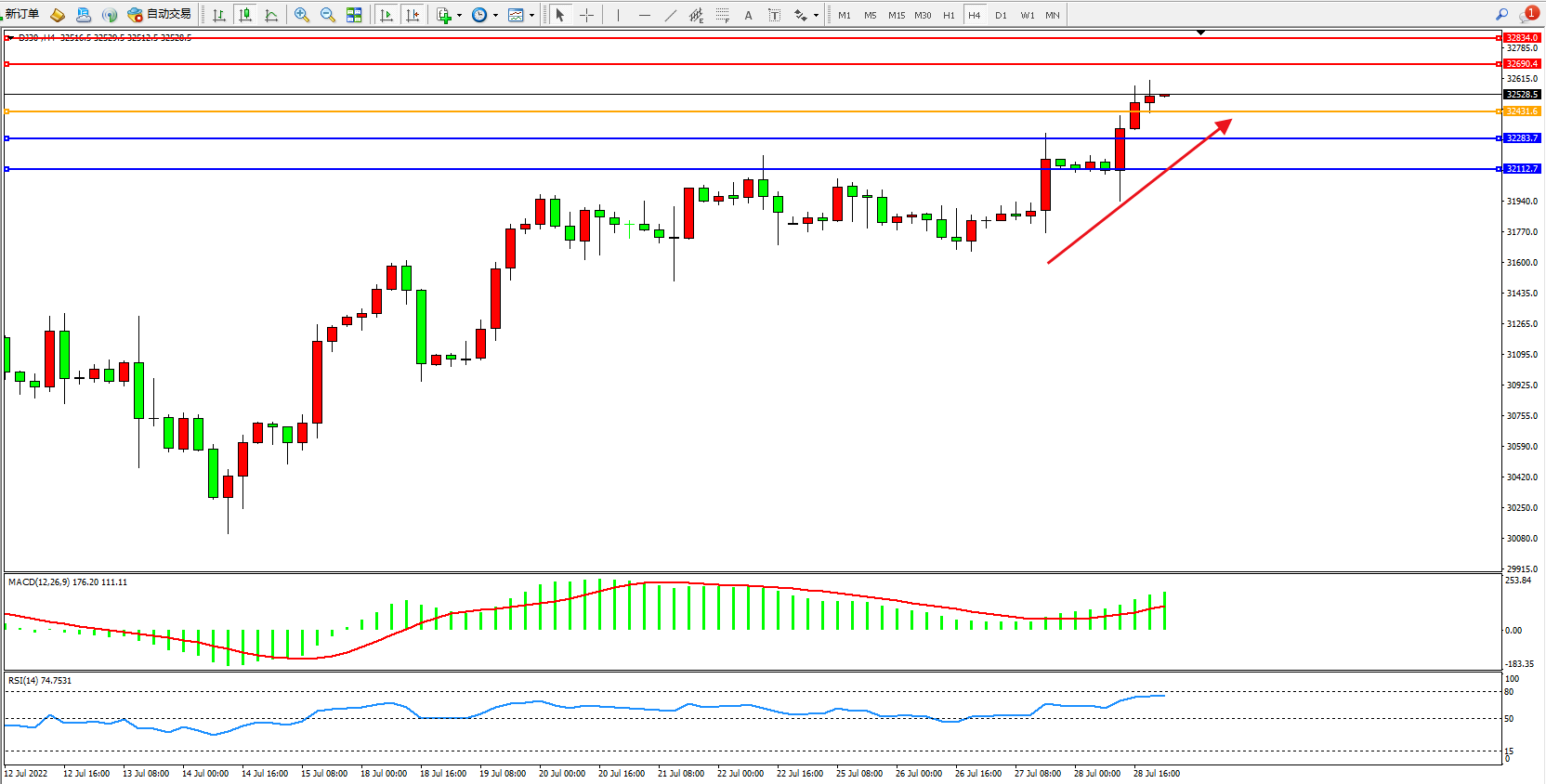 道琼斯指数7月28日(周四)收盘上涨329.27点,涨幅1.02%,报32526.86点;在美联储主席鲍威尔暗示会在某个时候放缓加息后,公司债利差的风险溢价一度收窄5个基点,徘徊在一个月来最低水平。