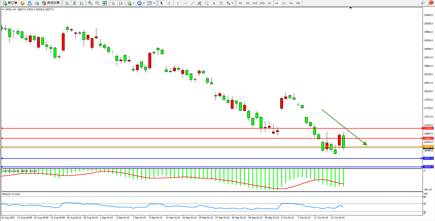 香港恒生指数10月14日(周五)收盘上涨198.58点,涨幅1.21%,报16587.69点;受昨夜美股绝地反击影响,港股结束6连跌行情。三大指数全天表现强势,恒生科技指数一度劲升5%,午后回落仍收涨1.55%,恒指涨1.21%,17000点得而复失,国指涨1.23%收复5600点。今日南下资金逆势净流入59.09亿港元,大市成交额为1019亿港元。