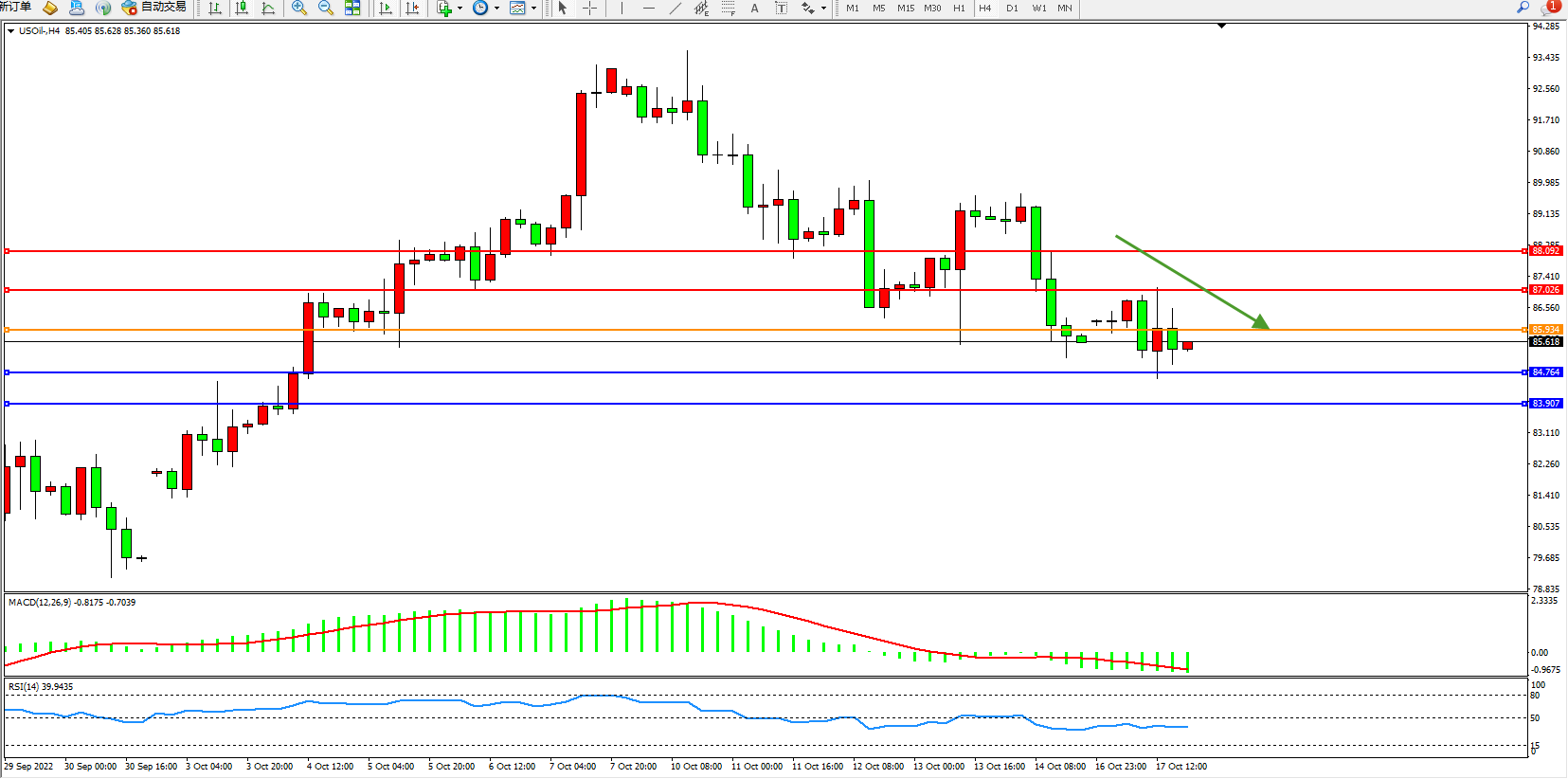 原油维持85.618附近震荡,美元原油钻井数据大涨至2020年3月以来最高水平,全球央行加息预期笼罩,对全球经济衰退的担忧挥之不去,油价后市仍有进一步下行风险。